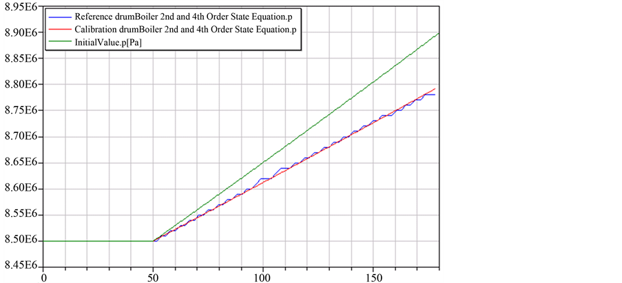 压力和水位特性曲线,绿色曲线为模型标定前压力和水位特性曲线。从图10可以看出,通过对模型进行标定,压力动态特性几乎与测量值完全一致,水位动态特性尽管与测量值还存在一定偏差,但也得到了进一步改善。这也说明在锅炉汽水系统中水位动态特性要比压力动态特性复杂。此外,仿真结果说明以燃油阶跃响应特性为依据进行标定的锅炉汽水系统模型,在耗汽量阶跃扰动下仍然得到了优化,表明通过标定可以获得全局最优模型。