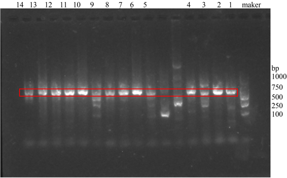 将分离得到的14株菌种进行PCR扩增(见图1),扩增产物进行琼脂糖凝胶电泳,待测菌株样品分别用1~14代表,扩增产物均在500~750 bp之间出现特异性条带,将得到条带进行切胶回收,提取DNA,纯化后测序。测序得到的14种微生物的16S rDNA序列,经NCBI上的BLAST在线对比,找出相似菌株如表2所示。