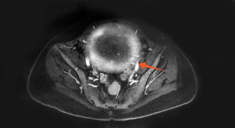 Figure 3. Pelvic MR: A large circular abnormal signal shadow is seen in the muscle layer of the posterior wall of the uterus, which compresses the iliac vein