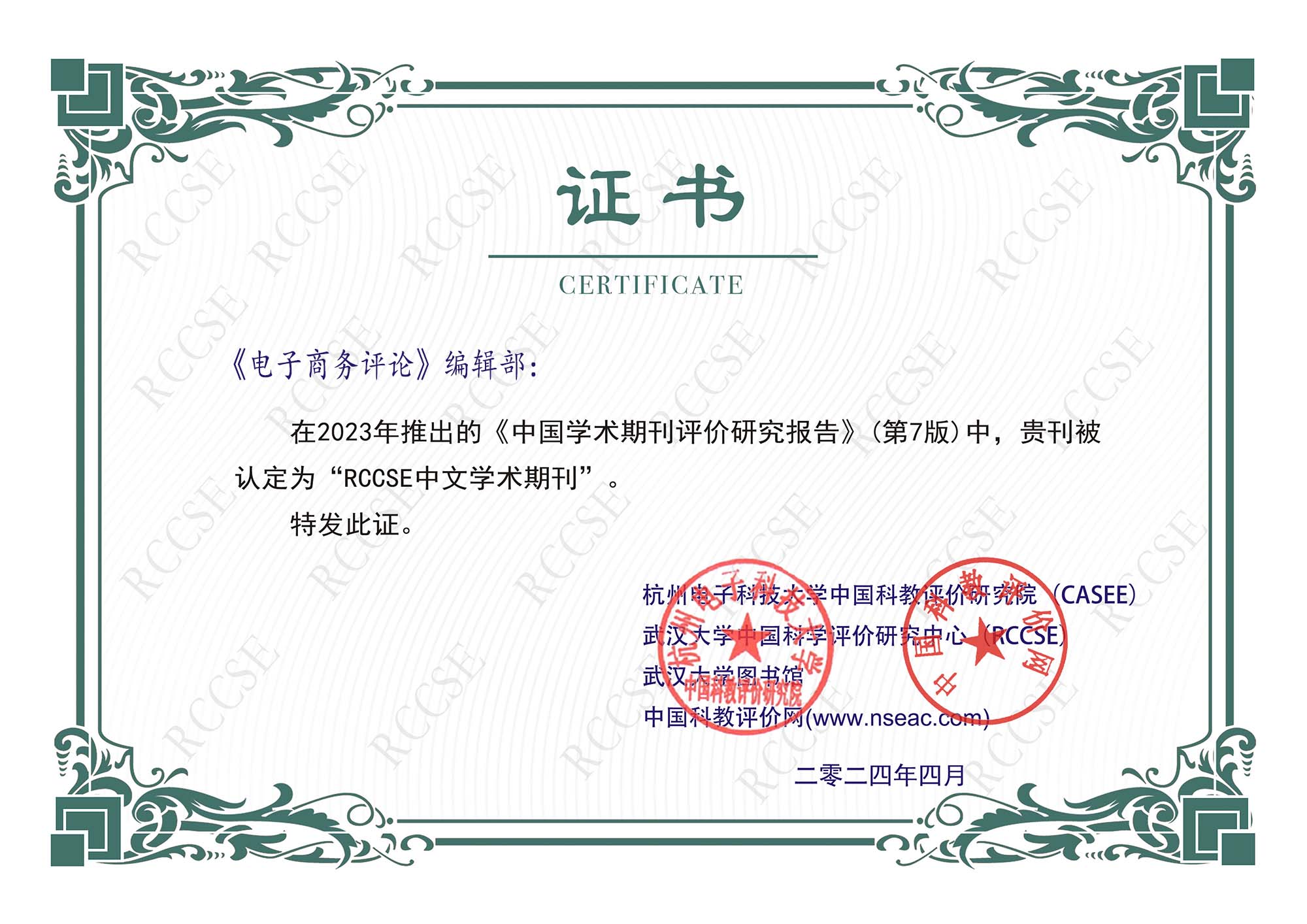 在RCCSE《中国学术期刊评价研究报告(第七版)》中,本刊被认定为“RCCSE中文学术期刊”。收录证书 中国科教评价网期刊收录信息