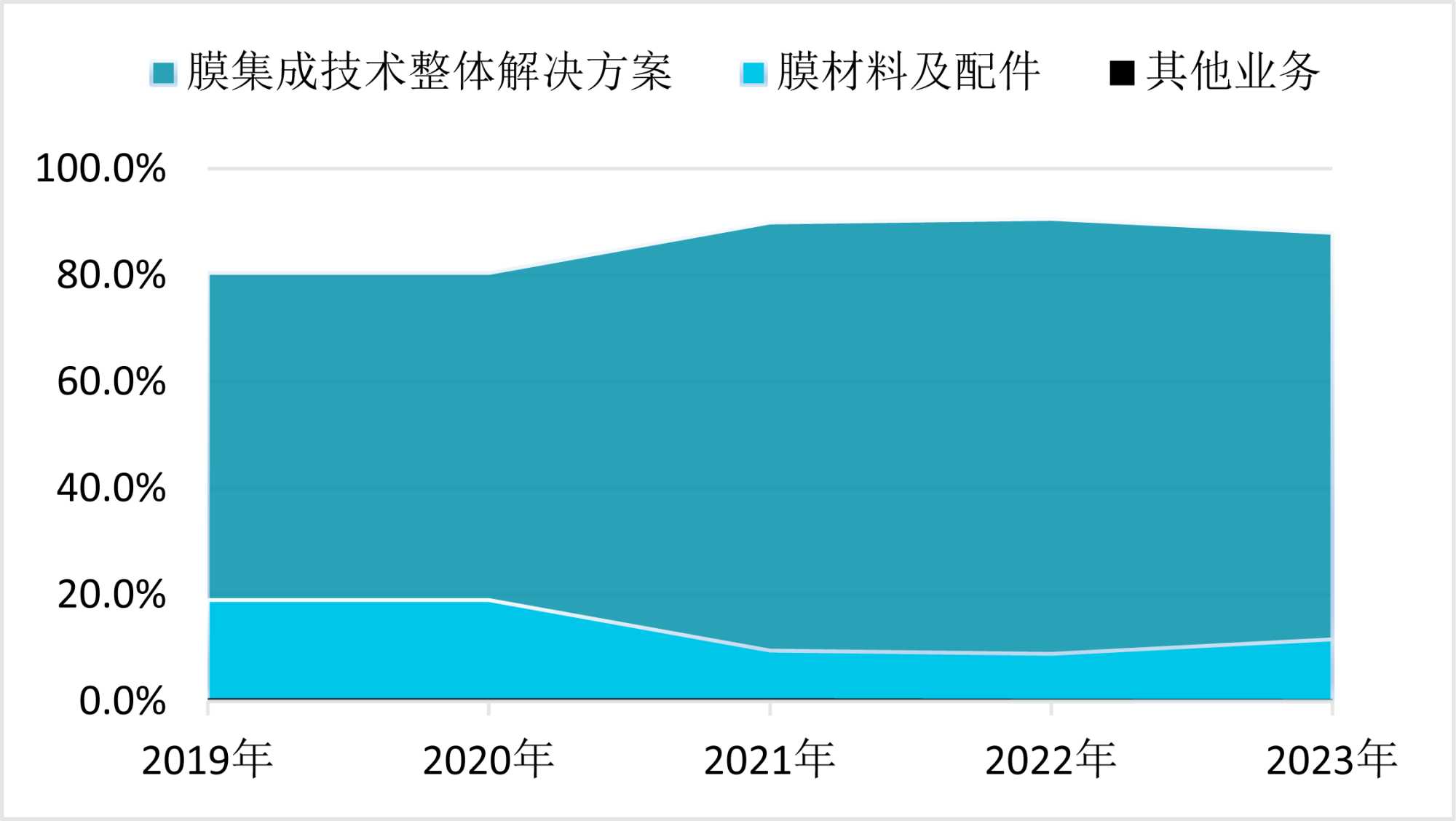 纵向结构分析:如表1所示,JW的主营业务(膜集成技术整体解决方案、膜材料及配件的出售)占比99%以上,其他业务占比极少。另外,主营业务中膜集成技术整体解决方案带来收入占较大比例(80%以上)。横向水平分析:如图1所示,主营业务占总收入比例波动不大,细分类别中膜集成技术整体解决方案所得收入占比呈现上升趋势。