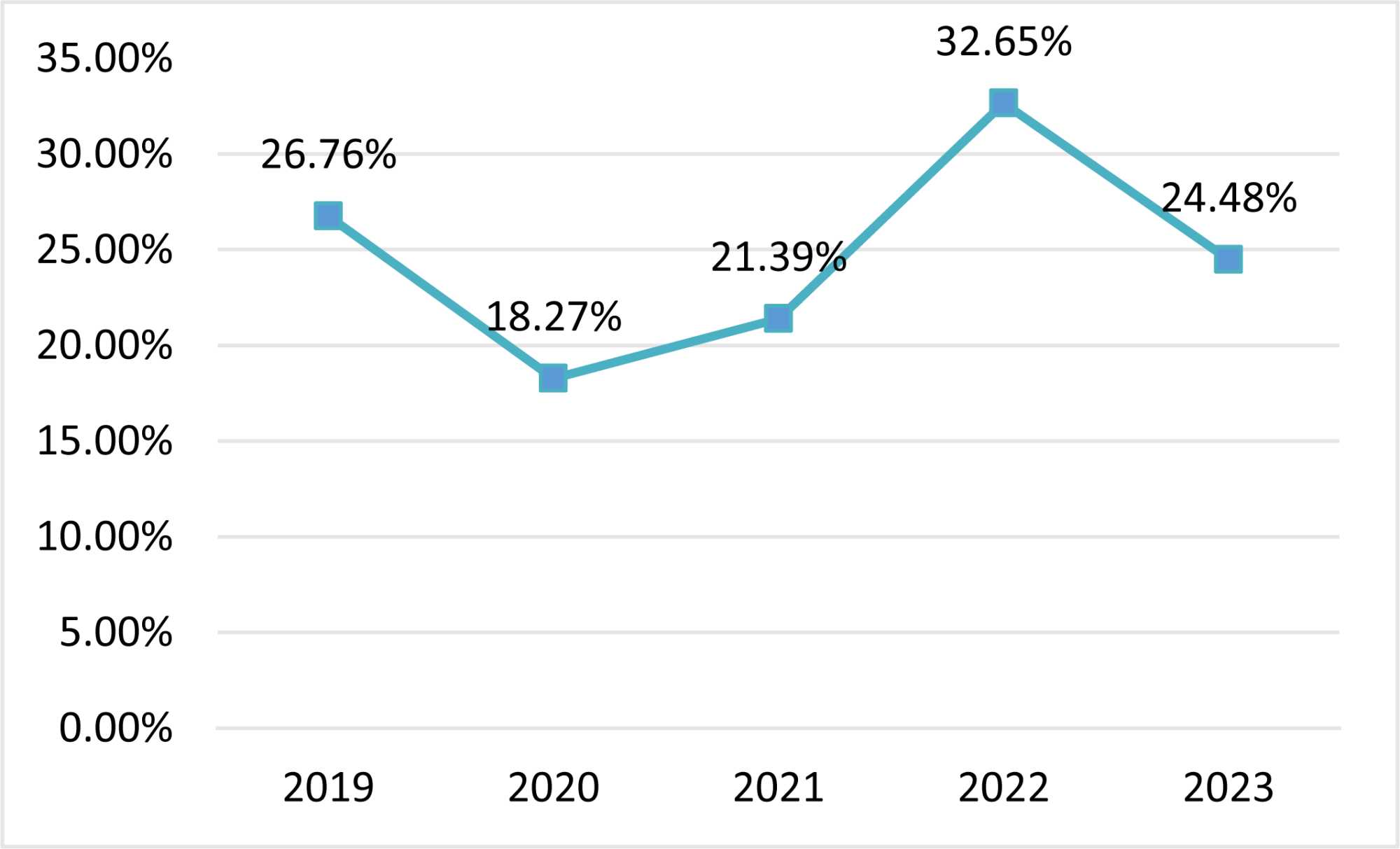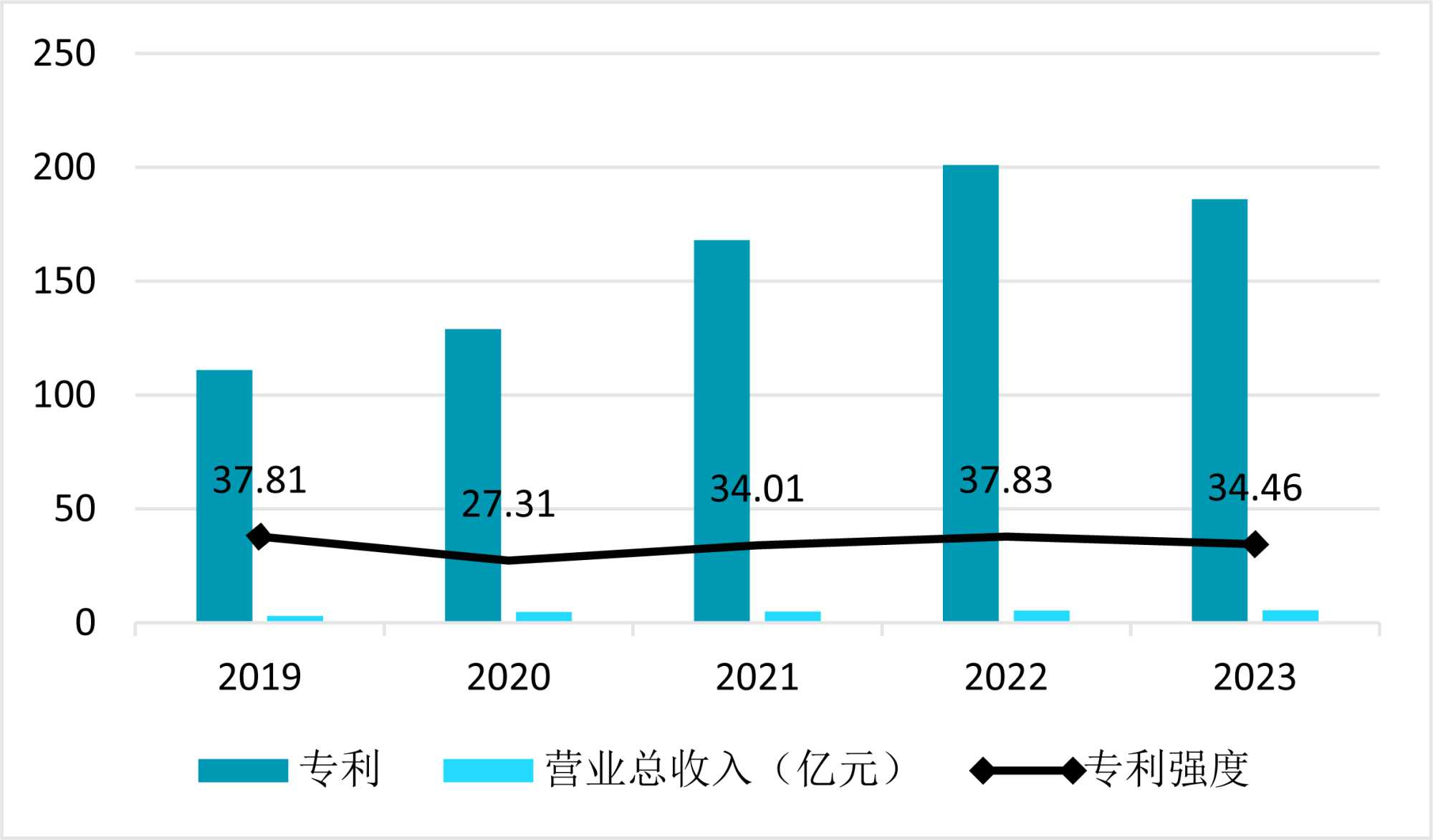 图7可知:JW近五年专利数量呈增加态势,其中在2021年出现略下降。结合企业经营状况分析,营业收入呈现逐年增长趋势,专利强度也保持在27以上,近三年稳定于34以上,可见企业积极鼓励技术创新,表明企业更为专注技术精进与研发,且成果转化效率显著。