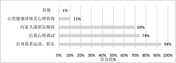 要想让研究生拥有积极向上的思想,就要不断加强对研究生的心理健康教育、思想教育和正确价值观的教育,使研究生能够明辨是非。如图3所示,自身需多运动、娱乐占比94%、自我心理调适74%、向家人或朋友倾诉69%、心里健康讲座占比为11%等,因此,部分研究生会通过自己的方式,如运动、娱乐、倾诉等方式排解忧愁,然而党支部也要采取相应的措施来引导研究生的心理健康发展。定期举办心理健康教育讲座,宣传和普及心理健康知识,对研究生出现的心理问题及时进行干预,使研究生能够正确面对网络世界,选择有益资源进行学习,充分发挥网络正能量的作用。疫情防控常态化下,思想政治教育对研究生的疏通和调适作用尤为重要。一是心理疏导,教育者要运用心理咨询、心理辅导等方法,对研究生的心理压力、心理问题进行有效宣泄和及时引导,提高学生的承受能力、抗压能力。二是情绪调节,疫情防控常态化下,研究生难免会遇到矛盾和挫折,开展思想政治教育有助于解决学生的情绪问题,使学生的不良情绪得到及时有效的调适。三是人际关系调节,引导研究生正确处理人际关系,提高学生的人际交往能力和人际适应能力,构建和谐融洽、互帮互助的人际关系。