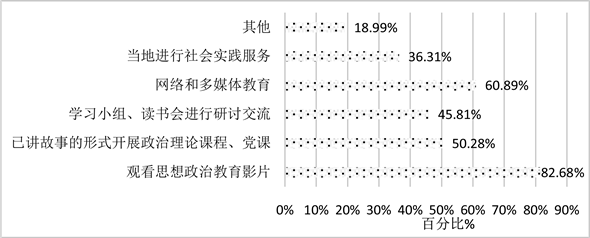 需将党建工作融入到研究生科研学习中,确保各项重点目标任务有序推进,全面完成。一是要创新中心党建工作思路,结合中心工作实际,通过开展“三微”(即:微书屋、微故事、微讲堂)活动,打造一支“服务意识好、工作业绩佳、党员及后备力量满意”的研究生党支部委员。二是党支部应及时开展思想政治教育活动,如图4所示,在疫情防控期间,研究生乐于接受的党员教育活动形式为,组织研究生观看思想政治教育影片占比为82.68%,网络和多媒体教育占比为60.89%,已讲故事的形式开展政治理论课程、党课占比为50.28%,学习小组、读书会进行研讨会交流为45.81%,当地进行社会实践、其他活动占比为36.31%、18.99%。因此要积极进行线上宣传,营造思想政治建设氛围,可以组织同学们观看思想政治教育的影片、学习小组及读书会进行研讨交流、组织一些线上游戏活动、开展优秀党员的自身故事讲述,传授理论学习及学习经验,为大家提供经验以及建议等不枯燥而且容易接受的活动,调动研究生参与活动的积极性。三是增强网络思想政治教育内容的时代性,当前处于疫情时代,网络聚焦的政治、思想及舆论等方面的问题往往是对现实社会的直接反映,网络思想政治教育则应该紧跟时代步伐,教育平台建设要贴切研究生学习和生活,实现内容的及时推送与更新。