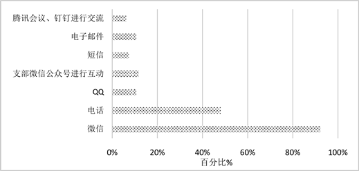面对上述党员及后备力量间沟通不畅的问题,党支部需要不断拓宽、创新党员沟通渠道、完善党员沟通技巧,这是党建工作与时俱进的必然要求。如图5所示,疫情期间党员及后备力量所接受的交流渠道为微信92.18%、电话48.04%、支部微信公众号进行交流11.26%,电子邮件,QQ,短信,腾讯会议、钉钉等进行交流占比为10.61%、10.61%、7.26%、6.14%等,因此党支部可采用图文、音频、视频等呈现、讲解方针政策,以党员及后备力量喜闻乐见的多元化形式塑造良好形象,引导舆论积极导向。另一方面,利用微信、电话、开通微信公众号留言、公众邮箱等方式,听取吸纳民声民意,传达解读最新政策,进行沟通与交流。这样便可能打破信息延迟与信息不对称壁垒。对于党员及后备力量留言,党支部要及时给予回应,强化党员之间的交流,增加他们的归属感和荣誉感。