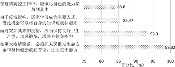 如图1所示,面对疫情,研究生群体人生态度积极,乐于奉献,展现出新时代青年应具有的责任担当和精神风貌。认为在重大疫情面前,必须把人民群众生命安全和身体健康放在首位,生命重于泰山占比为98.32%;应当保持良好卫生习惯,加强锻炼,增强身体免疫力占比为93.30%;也有同学认为,借助居家学习机会可以将自身的知识短板补起来占比为5.47%;在疫情防控工作中应该尽自己的能力参与到其中占比为83.80%。说明,大多数研究生持积极的态度,但还有部分研究生存在消极的态度,因此还需积极做好思想政治工作。