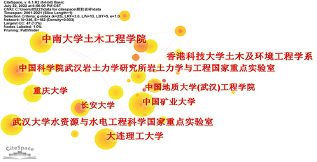 2) 中南大学土木工程学院,香港科技大学土木及环境工程学系,大连理工大学,中国科学院武汉岩土力学研究所岩土力学与工程国家重点实验室,发文量远高于其他机构,说明以上机构在关于“颗粒破碎”领域的研究较为深入,可以将科研成果与其它机构共享,形成更为紧密的合作研究联系网络。