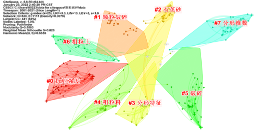 在研究初期(2001~2008年),国内相关研究人员开始逐步探讨颗粒破碎的实体研究,即聚类#1。中期(2008~2011年)主要研究颗粒破碎的主题类别,国内学者提出了许多关键技术和理论原理,颗粒破碎的不同特点和管理新技术,即集群#2、#4、#6。总体研究表明,说明颗粒破碎领域的研究主要集中在2009年以后的几年,该领域的研究呈现出发展稳定期。由表4可知,包含重要数据前三位的是剪切强度、粒子破碎、石英砂。希望有关人员在今后的研究过程中能够将颗粒破碎的各个分类有机地联系起来以提高整体性,进行多角度的分析。结合图6时间分布来研究,#0,#5,#7聚类代表的研究时间跨度最长;#3、#4、#6则在2019年以后没有出现,因此预计这两种集群目前比较完善,但#0、#1、#2、#5、#7等集群都继续作为研究热点进行研究。