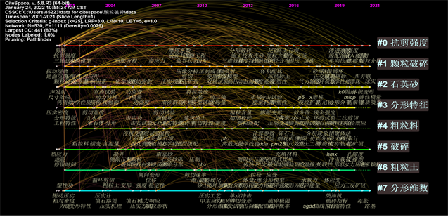 进行Citespace聚类分析,在图5中,模块值Q = 0.5563,该模块值表示此聚类的效果良好,平均轮廓值S = 0.8280,由此可见,2001~2021年“颗粒破碎”领域的研究主要在图5中的八大聚类模块展开。从年份上不难看出,学科开始发展是在2008年前后。因为在08年之前有关“颗粒破碎”的学者较少,所以导致该学科在08年之前都发展得很缓慢。在08年以后,我国大力发展各种基建项目,与此同时伴随着很多有关岩土颗粒的问题,所以导致“颗粒破碎”的研究蓬勃发展。