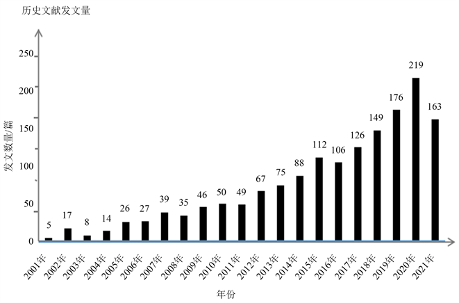 图1. 2001~2021年中国“颗粒破碎”发文数量分析图