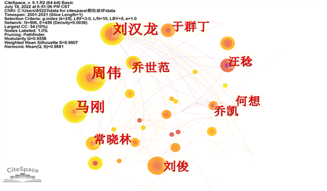 对数据进行可视化分析,得到了文献作者的群体如图2所示,其中此次的可视化分析结果图中共计506个节点,459个连接,网络密度为0.0036。所以可以得出在“颗粒破碎”学科领域,作者之间的联系总体上呈现“整体–局部”的网络联系状,初步展现出了4个大集团,虽然有一些作者零星分散在大集团周边,但在“颗粒破碎”领域也算聚类较为紧密。由表1分析可知,“整体团队部分”以周伟、刘汉龙、马刚等为核心,在此团队中发表了大量有关颗粒破碎的文献,并且在这个团队中有几位研究人员的发文量都在30篇以上。但是大部分研究人员的发文量都在2~4次,说明虽然有关“颗粒破碎”的研究团队聚类较好,但在大团队中相关核心研究学者较少。此外以刘汉龙,乔凯,何想为核心的团体还有以周伟和刘俊等为核心的研究团体之间联系最为紧密。而在“局部部分”中,存在独立研究“颗粒破碎”的领域的研究人员等。经图2分析可知,就相关作者的联系而言,目前我国有关“颗粒破碎”的研究形成了围绕核心作者的团队之间的联系,但是对于大部分从事“颗粒破碎”的研究人员处于比较分散的状态,但都有向核心团队靠拢的趋势。由此可预测,有关“颗粒破碎”的研究在未来的发展过程中,合作联系程度会越来越深,并且“颗粒破碎”的研究发展也将逐渐走向成熟。