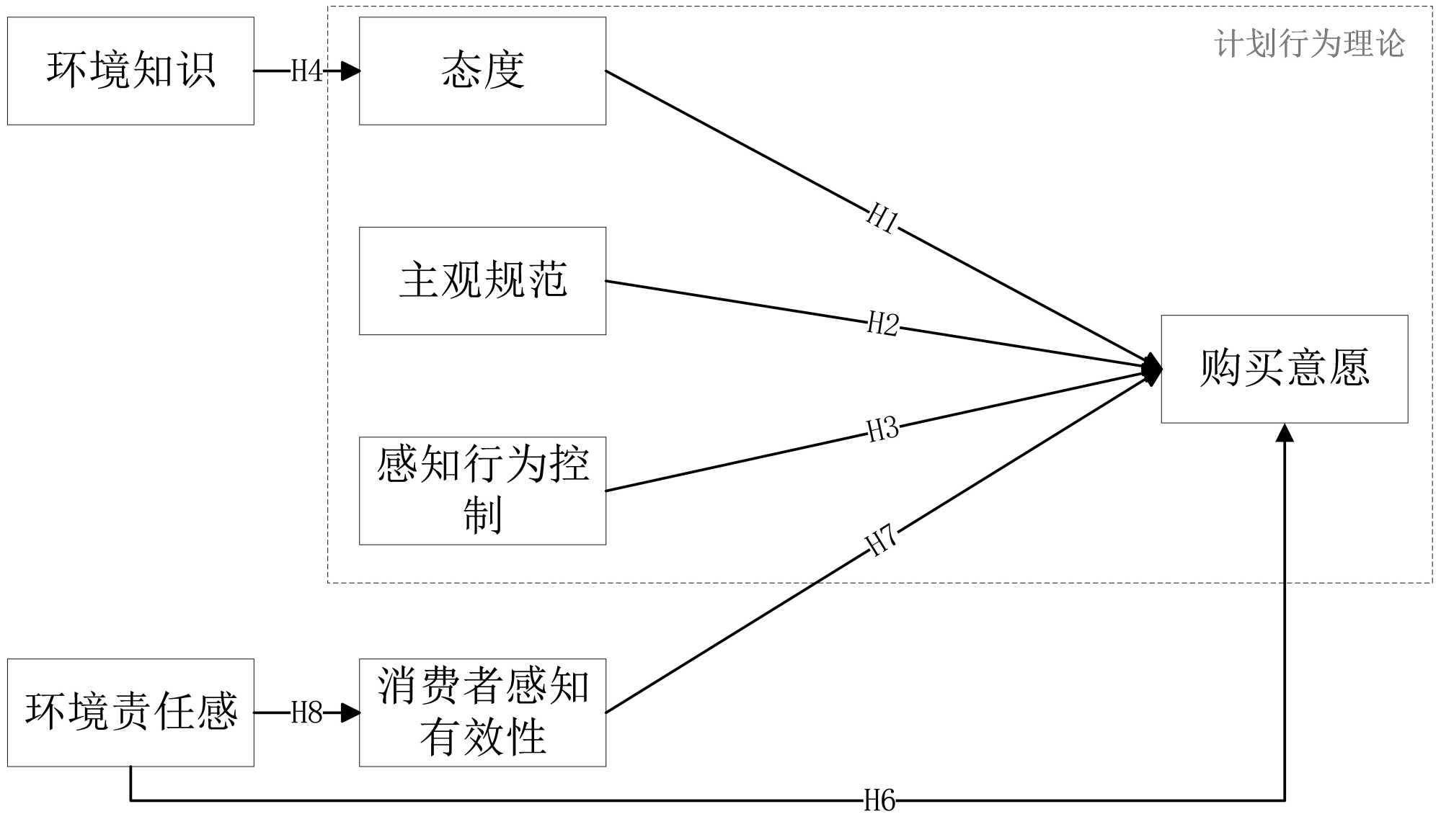计划行为理论(Theory of Planned Behavior, TPB)是由Ajzen [7]在1985年提出的,它作为研究消费者心理与行为关系的重要理论框架,不仅继承了理性行为理论(Theory of Reasoned Action, TRA)的核心思想,还对其进行了进一步的拓展和深化。在TPB的框架下,态度和主观规范被视为驱动消费者行为意愿的关键因素。其中,态度(attitude)代表了个人对特定行为所持有的积极或消极的评价与感知,它反映了个体对该行为的内在喜好和倾向。而主观规范(subjective norm)则是个体在决定是否采取某种行为时感受到的来自外部的社会压力,这种压力可能源于社会规范、周围环境的期望以及群体压力等多重因素。然而,在实际生活中,行为意愿和实际行为并不完全取决于态度和主观规范。以电动汽车的购买为例,消费者的购买行为不仅受到他们对电动汽车的态度以及周围人的影响,还受到他们对购买电动汽车难易程度的感知。因此,为了增强TRA的解释能力,Ajzen [8]在1991年引入了感知行为控制(perceived behavior control)这一变量。感知行为控制代表个体在采取某种行为前对其难易程度的预判,它作为行为意愿的重要推动因素,有助于我们更全面的理解消费者的决策过程。综上,态度、主观规范以及感知行为控制共同构成了行为意愿的前导变量,这些因素通过影响购买意愿进而影响购买行为。
