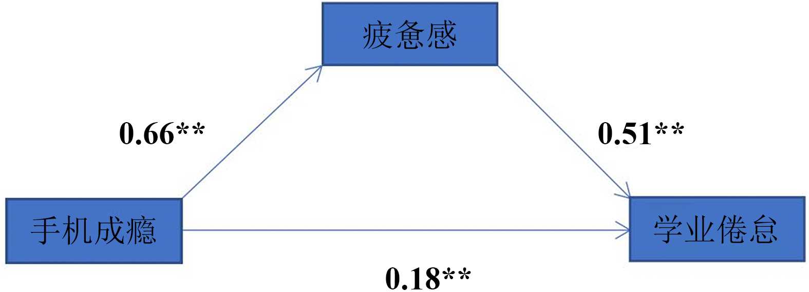大学生手机成瘾会导致疲惫感,进而产生学业倦怠,即疲惫感可能在手机成瘾和学业倦怠之间有中介效应。