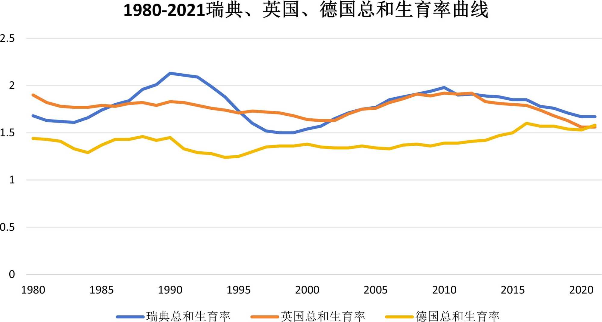 图1. 瑞典、英国、德国历年总和生育率走势图