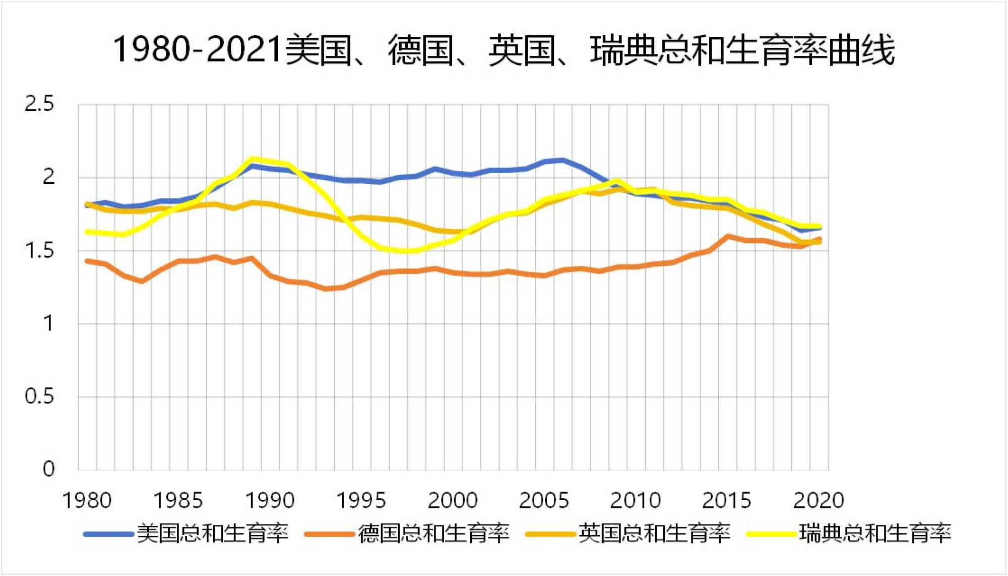 图3. 美国、英国、德国、瑞典历年来总和生育率走势图