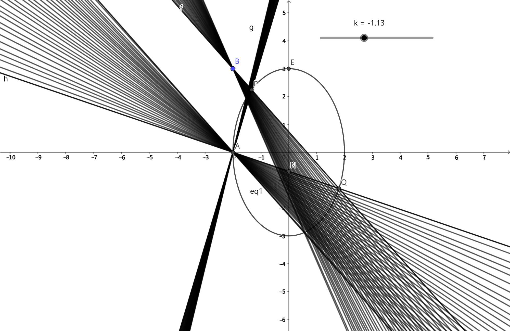 ,拖动滑动条,可以观察出形成三部分阴影区域,即图2中过点B的直线扫过的阴影部分轨迹(动直线1),直线f与椭圆方程eq1交于两点P、Q,连接AP、AQ (动直线2、3),并且M、N是运动的,而M、N的中点E(0, 3)一直是没有发生改变的,初步得到结论:M、N的中点是定点(0, 3) (图2)。