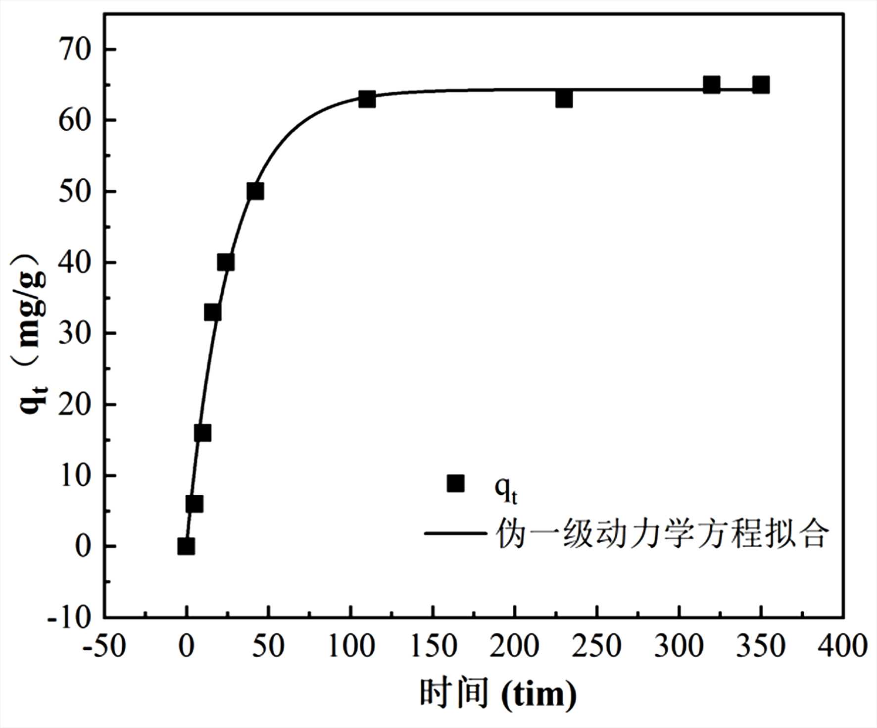 其中k1伪一级动力学模型的速率常数,min−1;k2伪二级动力学模型的速率常数,(g/(mg∙min));K3为Weber-Morris颗粒内扩散模型速率常数,mg/(g∙min1/2);t为吸附时间,min;C为Weber-Morris颗粒内扩散模型常数。