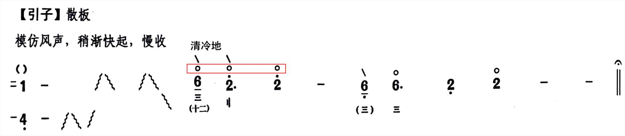 《松风寒》中的第一段,如图4谱例4采用泛音的演奏技巧,速度为自由,右手弹琴点靠近琴码,使音符更加明亮,过弦速度较快,使音符有力量,使声音听起来清冷,夜晚月光洒在有风的树林的感觉。