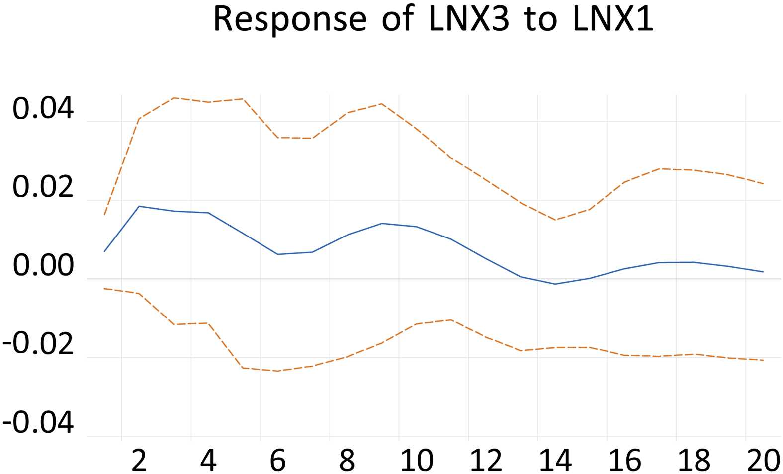 若剔除碳排放的自身贡献率,结果表明,产业结构合理化即lnx2对碳排放贡献率先变增后降,但基本保持在50%以上,这也是浙江碳减排的主要原因。lnx1经济增长,贡献率变化基本也是先增后减,峰值将在第21期出现。lnx3产业结构高级化对碳排放的贡献率基本是上升态势。最后,技术水平lnx4的贡献率相对最低,未突破5%。因此,说明了能源强度的提升优化,尚有较大的改善余地。