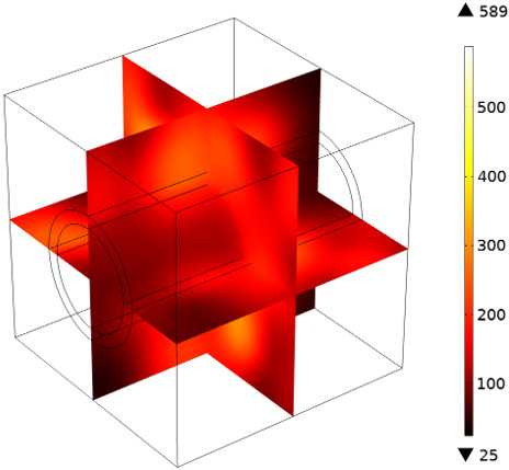为准确探究微波场中砂浆和骨料内的电磁、温度、应力分布和位移随时间的变化规律。模拟过程中,根据研究需求,在混凝土内部设置了两条监测线,在试样内部添加监测线,如图3所示。通过设置监测线,可以观测加热过程中,混凝土试件内部的电场、温度场和应力场之间的分布规律。其中,水平方向横截监测线,贯穿材料内部区域,可描述应力轴上的变化情况,测线坐标为(257, 205, 110)至(157, 205, 110)