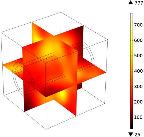 网格质量的高低直接关系到有限元仿真的计算精度以及计算结果。在COMSOL Multiphysics中,对于三维模型的网格划分要求最小单元质量要大于0.1。本实验采用“常规”网格划分,如图2所示。模型整体划分83,006个四面体单元,最小单元质量为0.1728,平均网格质量0.66,满足要求,证明了本模型的网格划分具有一定的合理性。