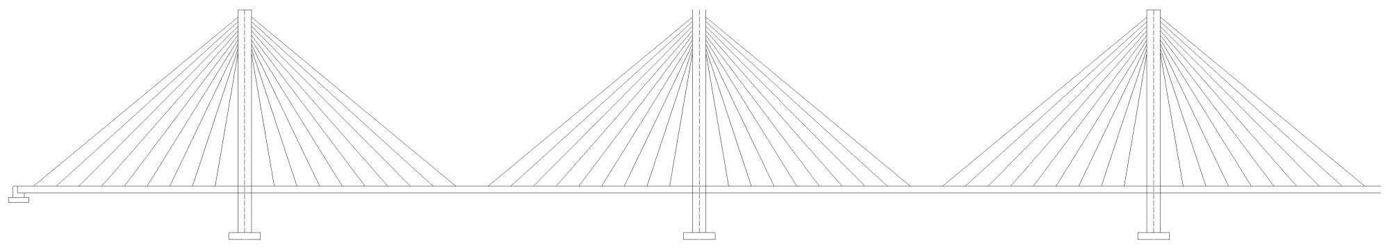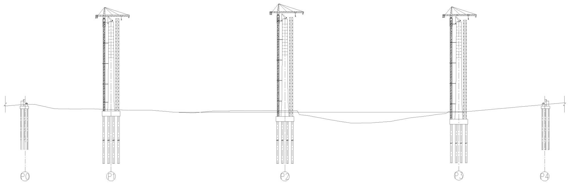 沣邑大桥施工流程可概括为:墩基施工→主塔施工→预制钢箱梁的施工→张拉拉索→附属设施施工→索力二次调整。其中墩基础自左至右分别命名为P1、P2、P3,如图1所示。具体施工步骤为:依次施工P1、P2、P3墩基础,翻模施工上方混凝土塔柱[5],适时施工桥台台身。拼装钢梁,焊接除合龙段外钢梁。施工主塔,安装斜拉索,按监控指令自塔柱向跨中逐根张拉斜拉索;斜拉索索力二次调整;精确安装桥端限位弹簧及桥台抗震措施;安装伸缩缝;通车荷载试验;全桥竣工验收,竣工验收后的大桥纵断面图如图2所示。