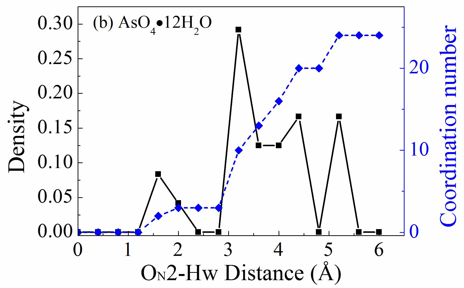 对[HmAsO4(H2O)12]3−m (m = 0~2)水合团簇中[HmAsO4]3−m周围水分子的分布情况进行了概率密度函数(PDF)及配位数分析。如图2是[HmAsO4(H2O)12]3−m (m = 0~2)水合团簇中As与水中氧(OW)的概率密度函数及配位数;图3为[AsO4(H2O)12]3−中砷酸根中ON与周围水分子中氢(HW)的概率密度函数及配位数;图4为[HAsO4(H2O)12]2−中砷酸根中ON与周围水分子中氢(HW)的概率密度函数及配位数;图5为[H2AsO4(H2O)12]−中砷酸根中ON与周围水分子中氢(HW)的概率密度函数及配位数;As-OW和O-HW的配位数是通过在PDF的第一配位层的最小值处的距离r作为相互作用的截断距离来确定的。