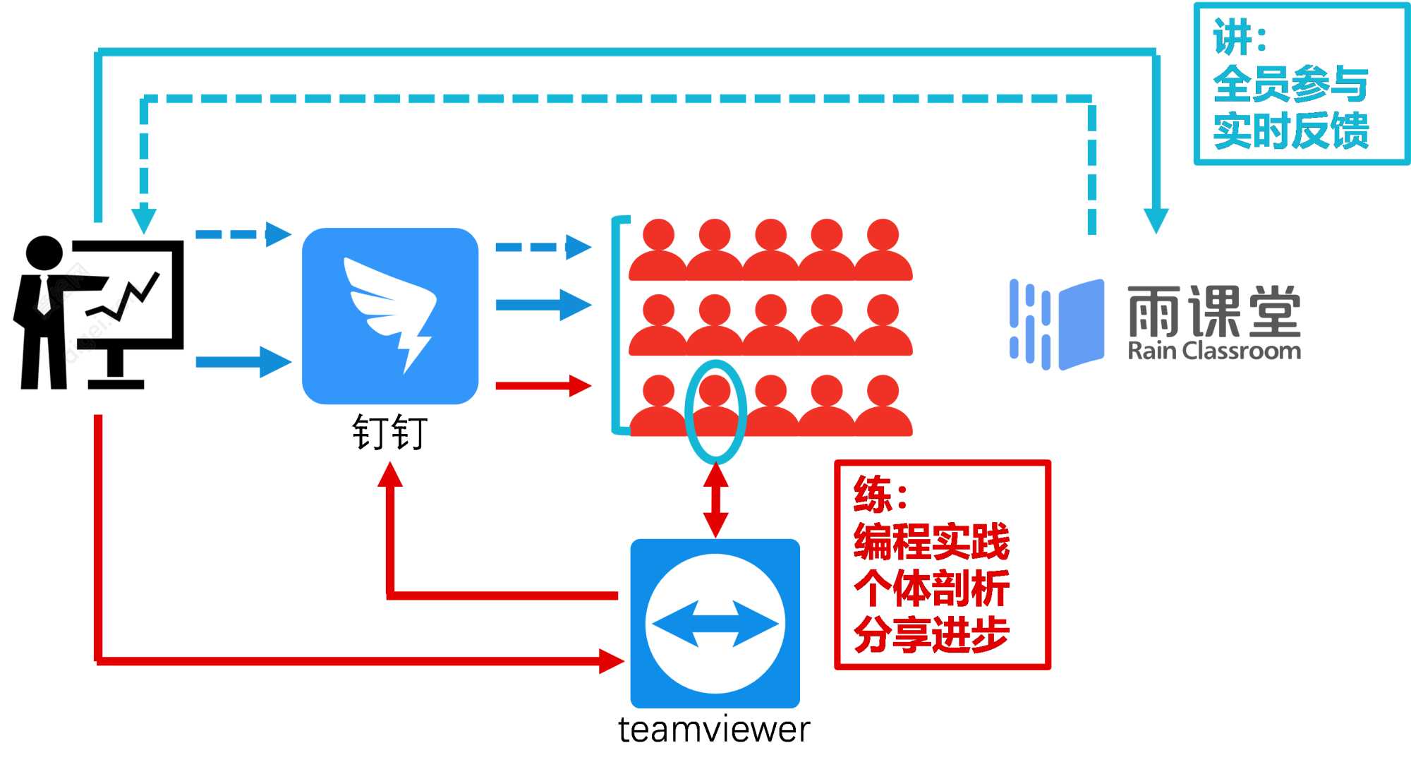 我们总结在线主讲教学的讲、练过程,如图1。首先,教员通过钉钉平台对学员进行群体授课。雨课堂进行快速的随堂考查问卷发送与结果反馈,帮助教员进行课堂秩序维护、教学效果反馈、调整授课进度。Teamviewer软件,在程序设计讨论环节,能够有针对性地对单个学员进行指导,同时将这个指导、实践的过程分享给全体学员。形成一个很好的远程在线教学有讲、有练的教学闭环。
