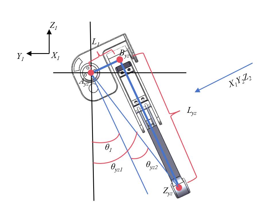 四足机器人的逆运动学[6]是指在已知足端位置及连杆长度的情况下,用解析法或几何法推导出各个关节的转角,从而控制四足机器人完成预期的运动。文本用几何法并以右前腿为例进行四足机器人单腿的运动学逆解。图6为右前腿的