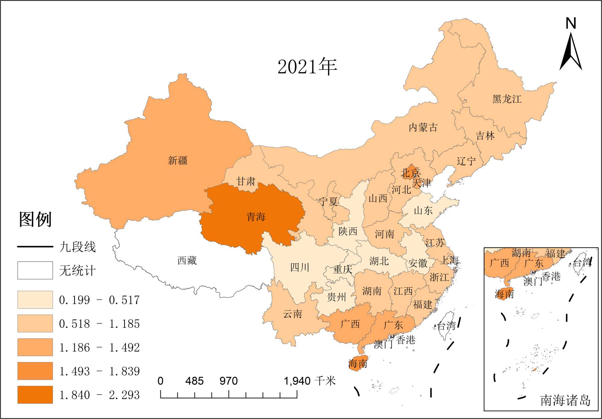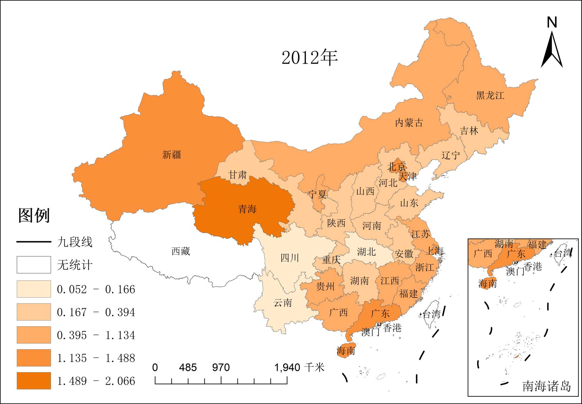 本文,选取2012年、2015年、2018年和2021年四年数据绘制GIS矢量图,从而更形象以及动态地分析我国30个省/市新质生产力发展效率。如图2~5所示。