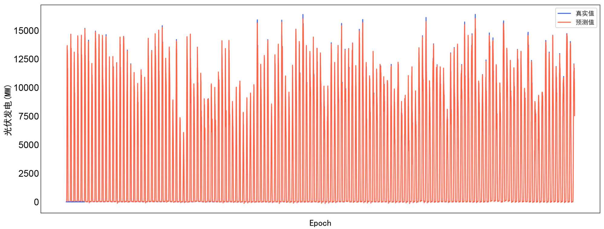 此处我们使用了2024年1月1日至2024年6月30日期间甘肃的历史光伏发电量数据(每日96个时段)在神经网络模型中进行训练,结果如图6所示。在模型训练过程中,真实值(蓝色曲线)与预测值(红色曲线)几乎重合,表明模型模拟效果很好,我们会通过模型得到良好的预测值。