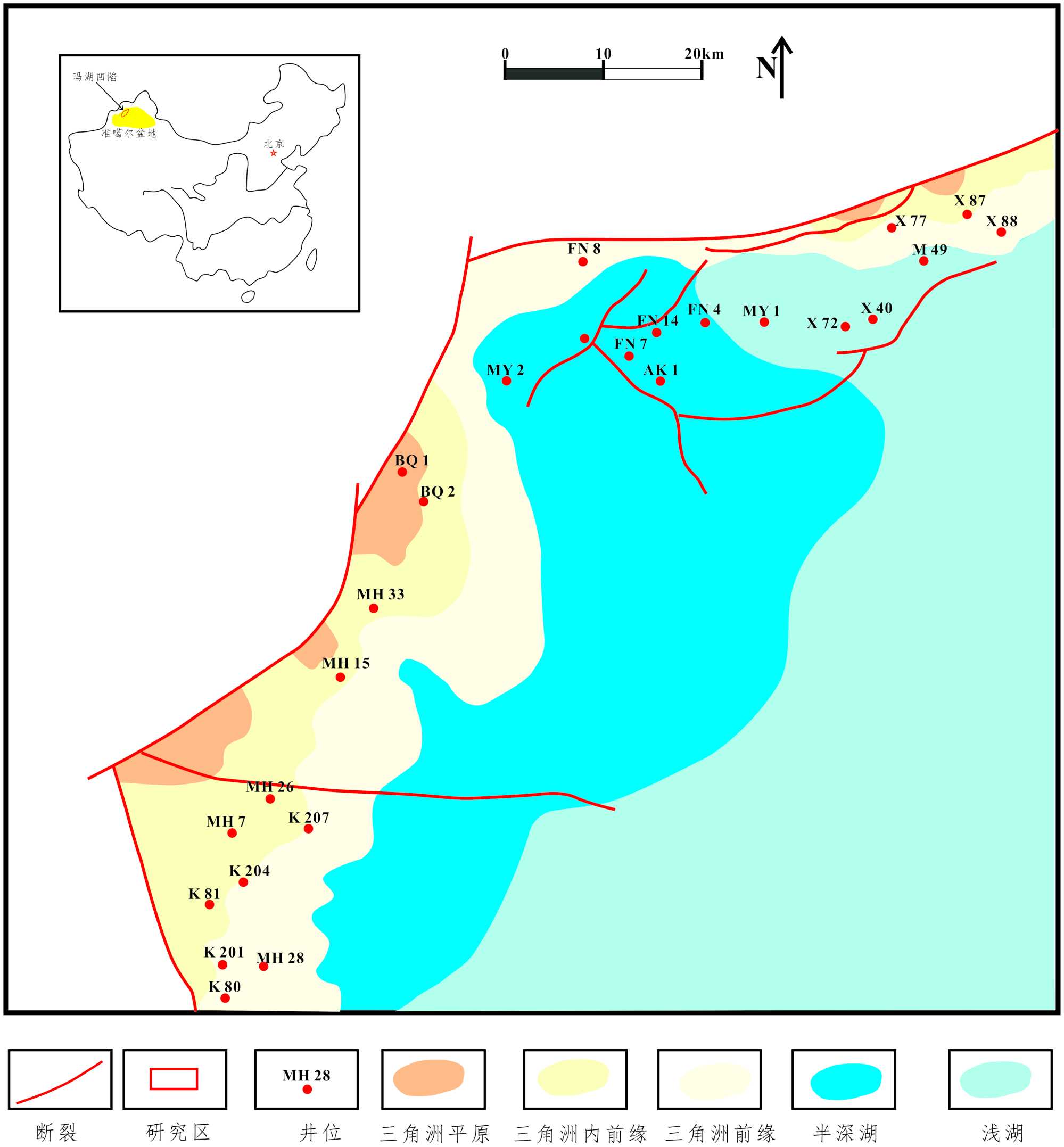 图1. 玛湖凹陷风城组沉积相图与研究区位置图