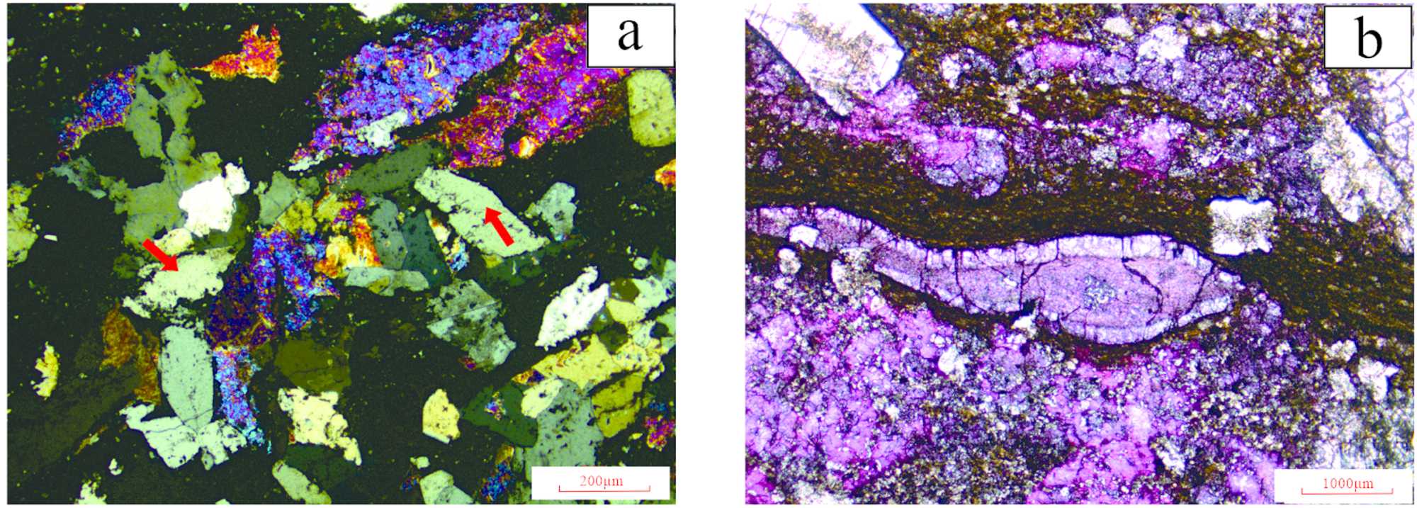 a. 硅硼钠石和碳钠钙石基本同时形成,AK1,P1f1,5667.25 m,+;b. 碳钠镁石被染成粉红色,K207,P1f2,4854.3 m,-。