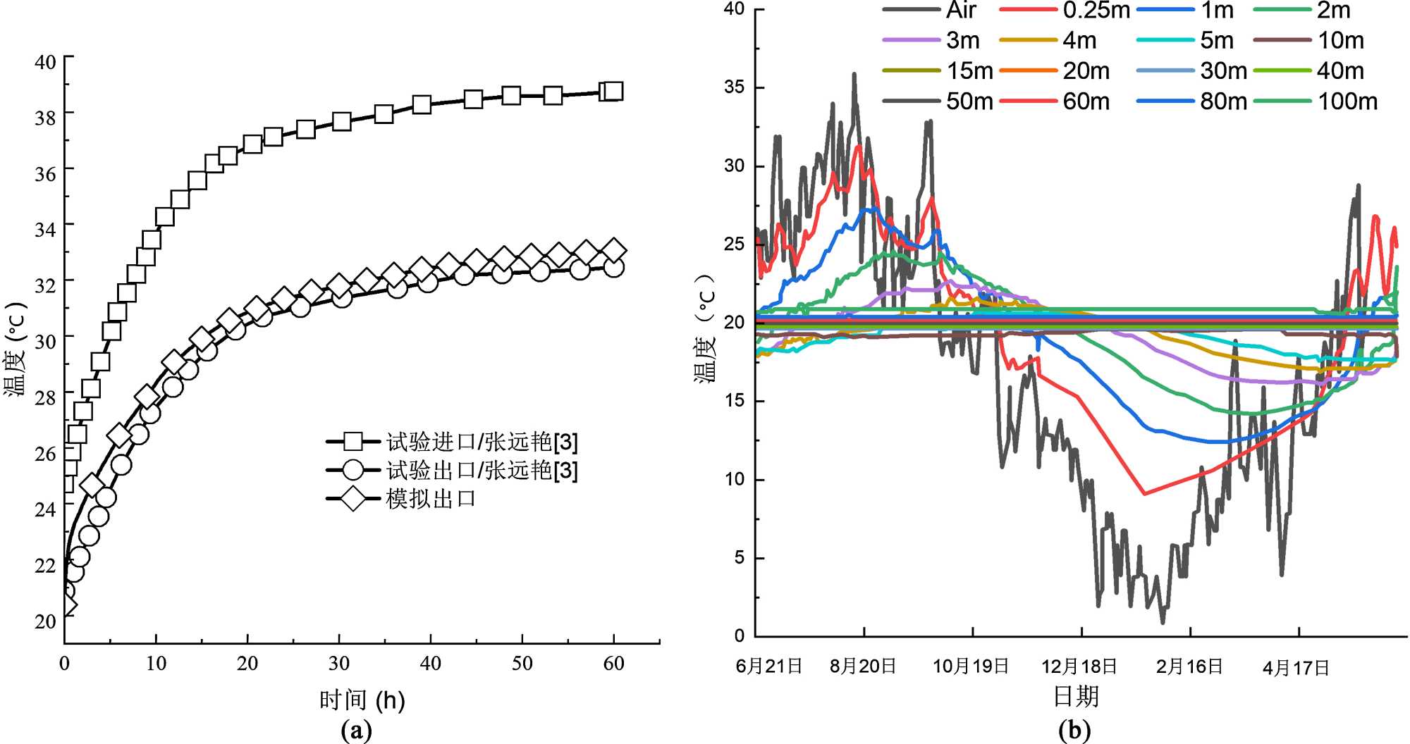 图2. 热响应试验数据,(a)地埋管进出口温度的现场测试数据[3]与数值模拟数据,(b)原始地温[3]