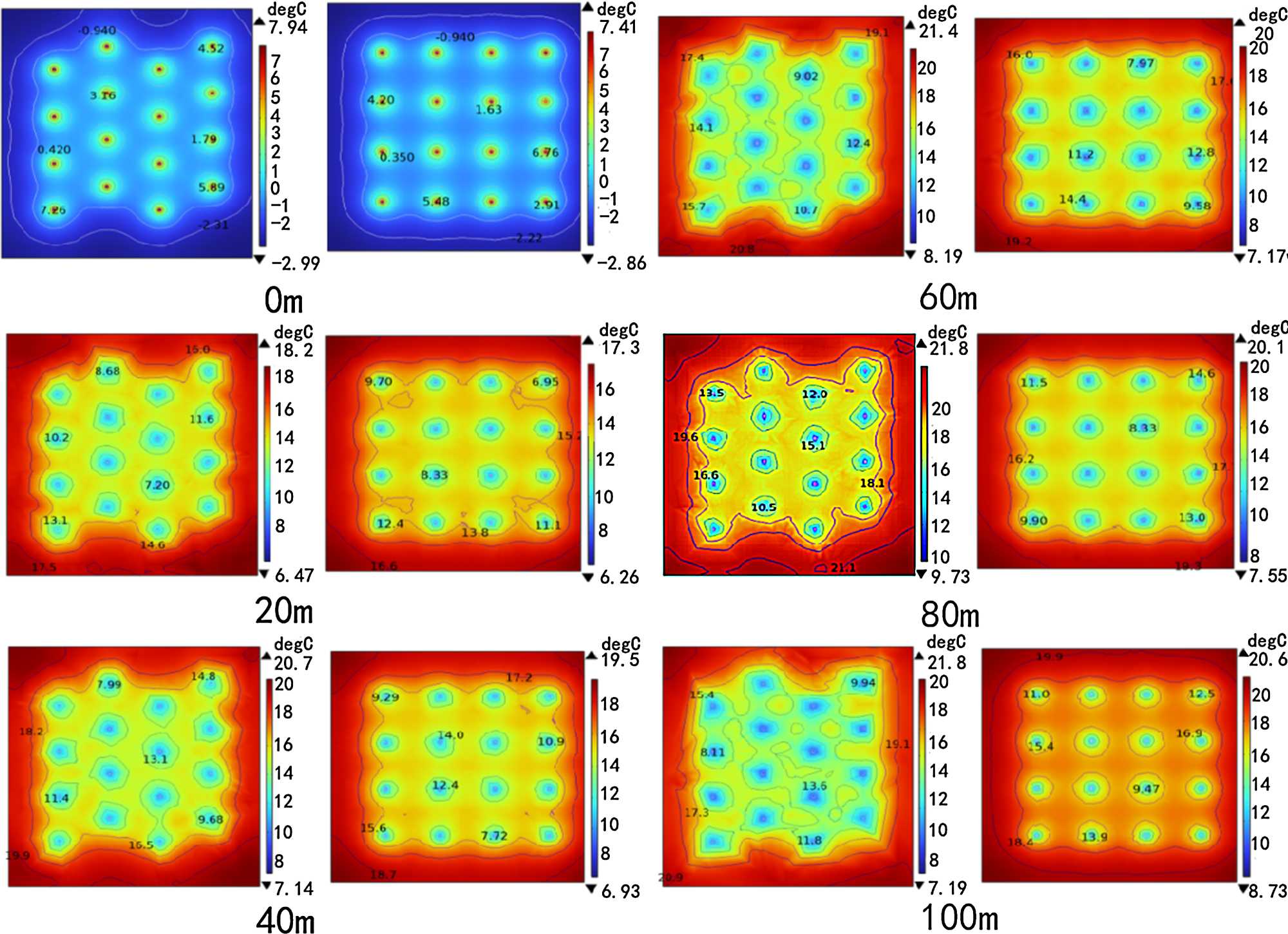 当埋管间距为5 m时,地埋管群的热干扰效应进一步弱化,在不同深度处都出现了较为明显的原始地温区域;埋管的温度极值区相互独立,不再连通;在0 m和100 m深度处,埋管的温度极值区被原始地温区域切割,原始地温区贯通;在20~80 m深度处,埋管温度极值区与原始地温区之间有副温区隔开,说明仍然存在着微弱的热干扰。