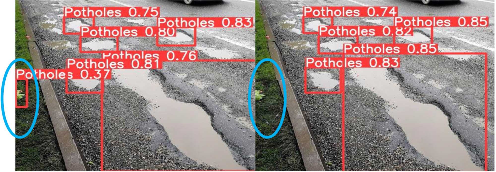 从表1可以看出,YOLOv5s opt表现更好:收敛速度更快;精度由81.1%提高到95.0%;mAP0.5由89.1%提高到92.2%;mAP0.5:0.95由48.2%提高到49.5%,此三项为判断检测精度的核心指标,即优化后的算法具备了更高的检测精度。根据表1所示,优化前后,FPS分别为13.7和13.3,检测速度无明显放缓,仍能满足实时检测要求,这是由于上述优化措施并没有大幅增加YOLOv5原网络的复杂度。此外,如图5所示,优化前模型将路边树叶错误的识别为坑洞(篮圈内),而优化后模型成功地避免了此类错误,降低了错检率,这意味着模型的泛化能力和准确性也得到了提高。