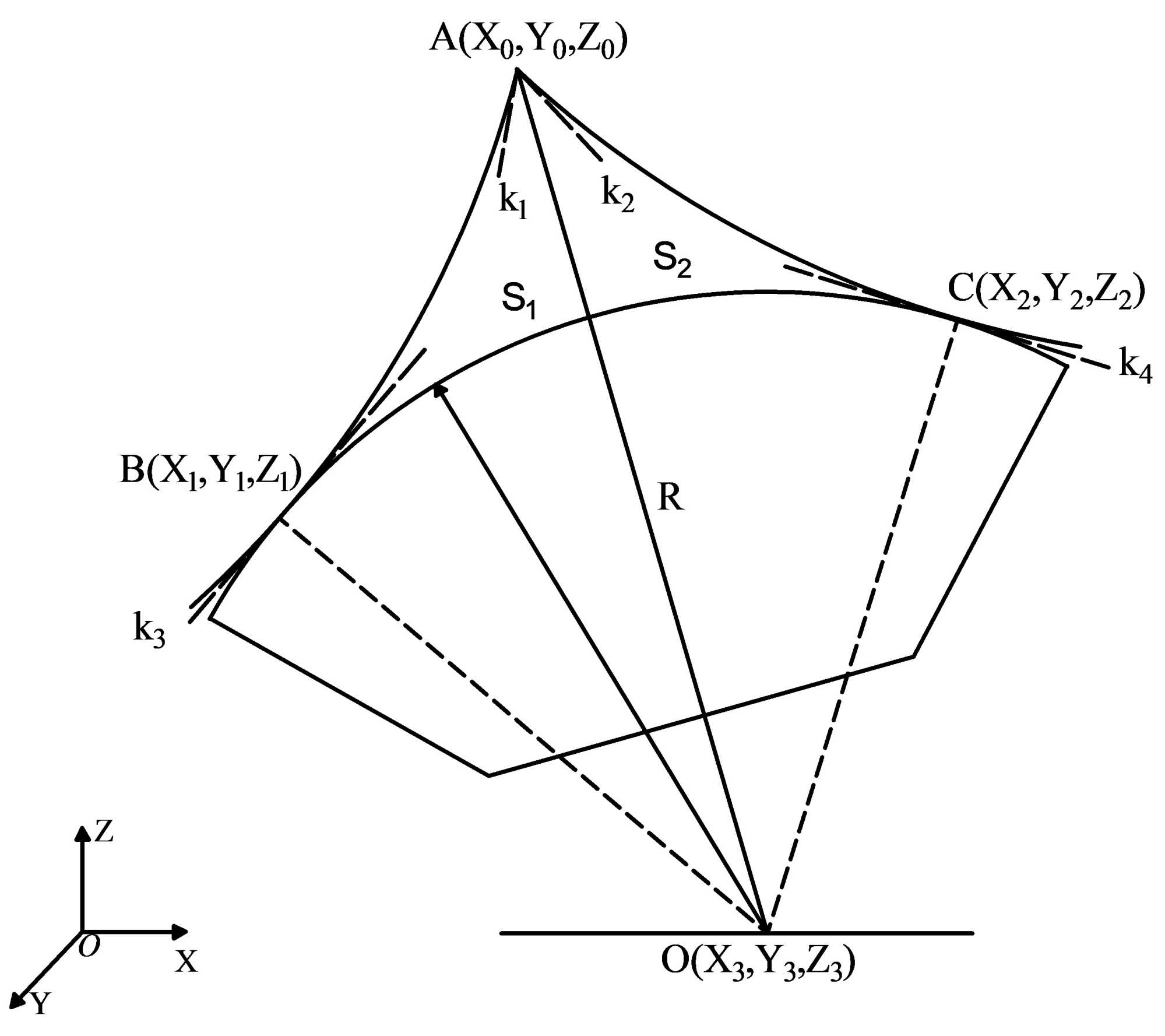 3) 坐标参数:成桥状态下索鞍理论顶点坐标A(X0, Y0, Z0),不动点右侧主缆与索鞍面的切点(右切点)坐标(X2, Y2, Z2),不动点左侧主缆与索鞍面的切点(左切点)坐标(X1, Y1, Z1),圆心坐标O(X3, Y3, Z3)。