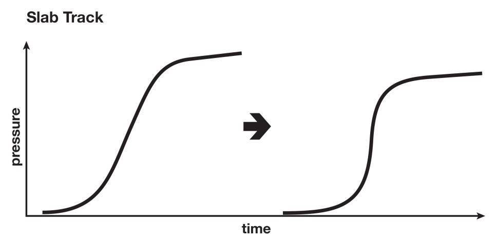 非线性效应导致的惯性变陡倾向于增加梯度,这是因为波的前面通过静止的空气传播,而波的后面通过与波移动方向相同的空气传播(后面的波的速度相对于波前面的速度更大,压力波的后面完全赶上了前面,压力波就会变陡)。在板式轨道隧道中,“激化”作用占主导地位,图1表示板式轨道中的压力梯度“激化”现象。当列车速度增加,或阻塞比增加时,坡度会变陡。虽然初始压缩波的梯度随列车速度的三次方成正比,但经过波的“激化”作用后,隧道出口的梯度变化甚至大于列车速度的三次方。