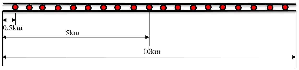 图6表示为研究压缩波波形演变规律所选取的隧道壁面压力测点分布示意图。隧道长度为10 km,每间隔500 m布置一个测点。