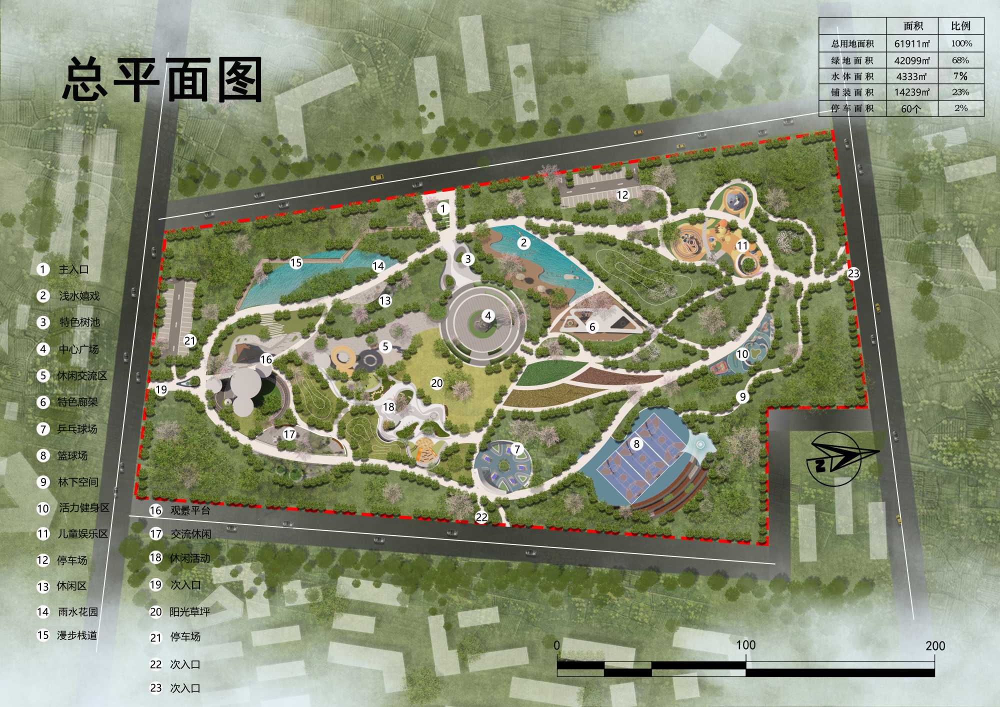 3) 可持续发展设计:公园的设计考虑长期的可持续管理,包括水资源管理、垃圾处理、绿化养护等方面,确保公园的可持续发展。