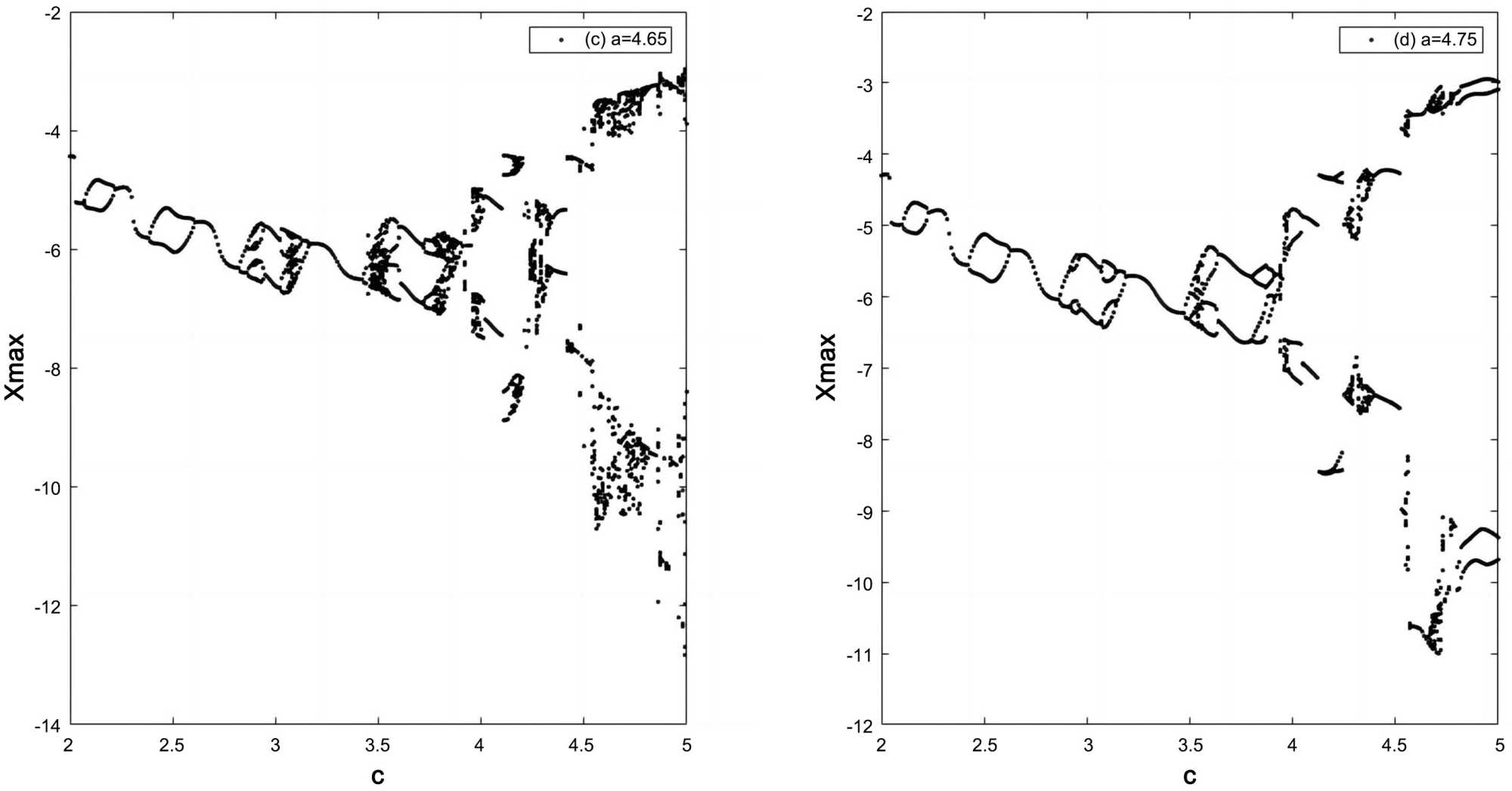 时,随着参数a逐渐增加,系统表现出不同的分岔行为;分岔图4中不同参数下控制着不同的周期现象,参数c的选取对状态变量