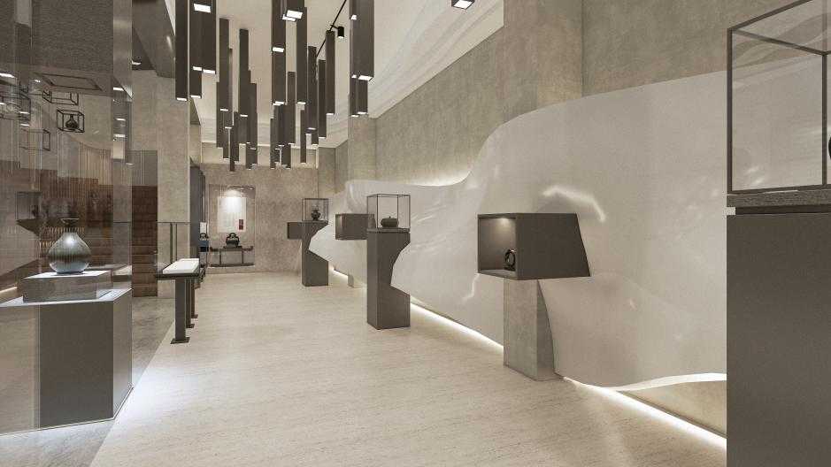 展陈设计中最常见的方式是为展品设置展台、展柜,龙山黑陶文化馆设计在此基础之上,将整体空间划分为多个展示区域,各区域的展陈形式都做了细致的要求,通过独特的展陈形式体现龙山黑陶之美和文化内涵。采用创新展示形式,综合运用实物展陈、展板设计、场景营造等展览方式,为龙山黑陶文化注入新的元素和内涵,凸显龙山黑陶文化馆设计科普性、趣味性和现代性的特点,从而实现文化的传承与创新,满足人们对于空间体验的追求。