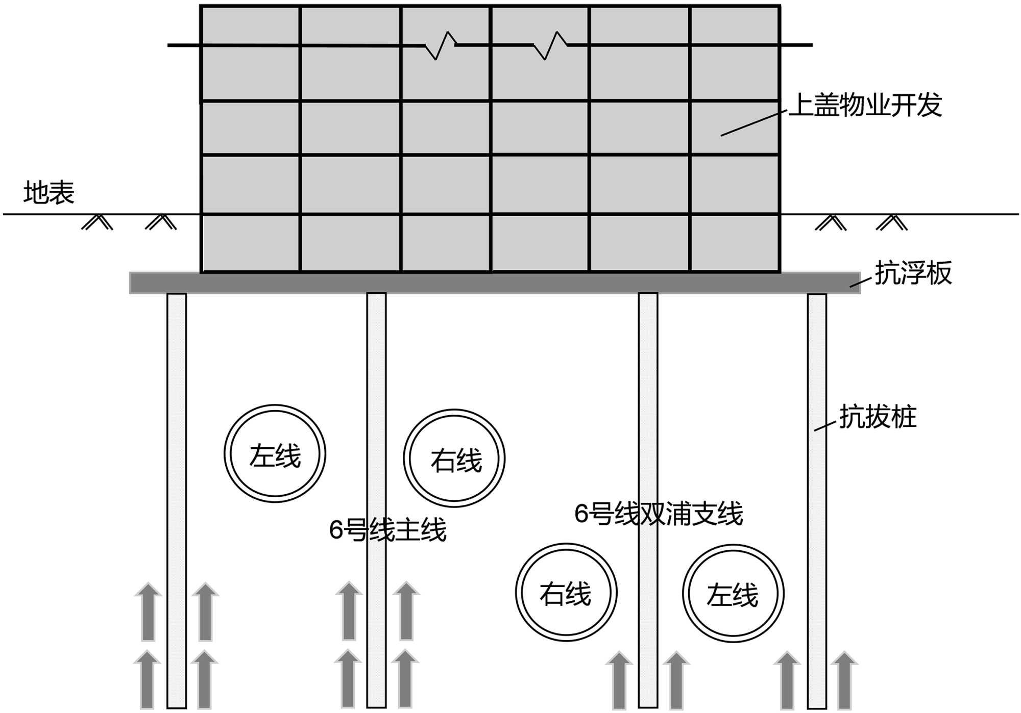 枢纽改造拆除对整体结构来说是一个减重过程,打破了原有结构与地下土层的力学平衡。抗浮板可以有效隔离既有结构与上盖开发之间的相互影响,抗拔桩则是利用桩身与土体之间的摩擦力抵抗地下结构上浮的一种有效的抗浮措施。杭州地铁6号线上盖物业开发工程为解决施工期间可能引起既有6号线车站结构上浮及变形过大问题,采用抗浮板和抗拔桩加固体系,如图2所示,在工程施工期间,既有6号线车站结构内部道床差异沉降、水平位移、管片水平收敛等变形监测均未超过地铁保护控制值,应用效果良好[15]。