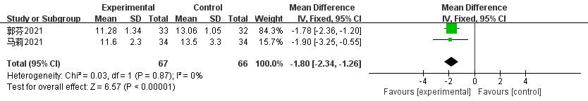 纳入3项研究,共250例患者,rTMS + 多巴丝肼组125例患者,多巴丝肼组125例患者,异质性分析显示各研究间异质性小(I2 = 0%, p = 0.49),故采用固定效应模型进行数据合并,Meta分析结果显示:与多巴丝肼组相比,rTMS + 多巴丝肼治疗PD后运动功能改善[WMD = −4.87, 95% CI = (−6.05, −3.69)],两组间存在统计学意义(见图10)。