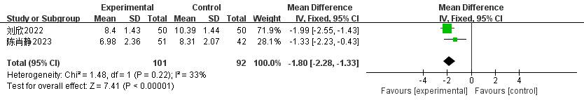 纳入3项研究,共299例患者,rTMS + 多巴丝肼组154例患者,多巴丝肼组145例患者,异质性分析显示各研究间异质性大(I2 = 83%, p = 0.003),故采用随机效应模型进行数据合并,Meta分析结果显示:与多巴丝肼组相比,rTMS + 多巴丝肼治疗PD后精神行为情绪改善[WMD = −2.13, 95%CI = (−2.99, −1.27)],两组间存在统计学意义(见图7)。进行敏感性分析,结果显示“王晋娜2020”研究未产生异质性的原因,排除该项研究后,异质性降低(I2 = 33%, p = 0.22),得到与最初Meta分析相同的结果[WMD = −1.80, 95%CI = (−2.28, −1.33)] (见图8)。