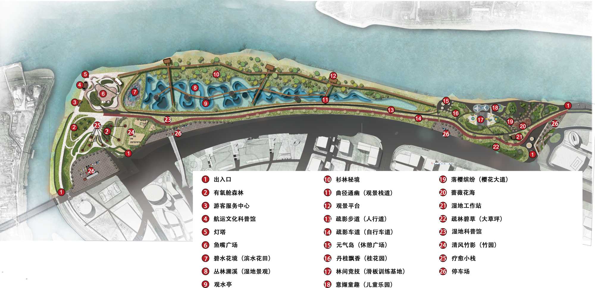 (4) 乐活健身区:以运动 + 康养为主,自行车道穿插其中,中心设有国家滑板训练基地和儿童乐园。