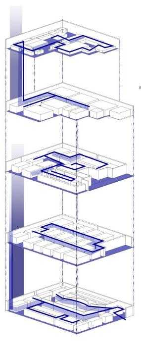 该建筑在设计中采用了山水、方体的元素,利用不同方体叠加,营造出山的层峦叠嶂,潺潺流水的感觉,此外,从上方看,两个卧倒的不同山形部分重合并划分出封闭空间、半开敞空间和开敞空间,满足了不同人的不同需求。同时由于建筑上方立面是凹凸的形态,可以引入更多的自然光,减少了建筑对能源的依赖(见图3、图4)。