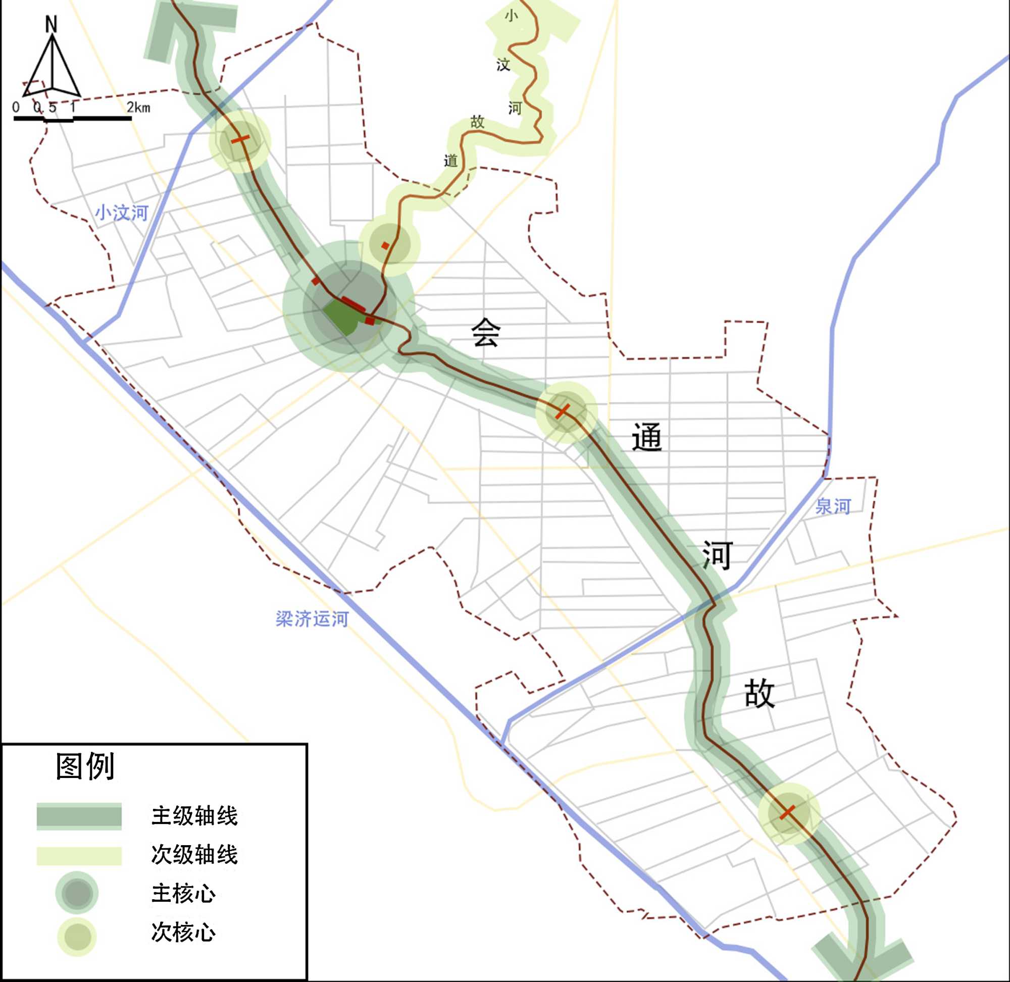 在保护开发的空间规划上,尊重南旺原有的空间脉络,以现有的文化遗产为基础,实现低影响开发。宏观尺度上,在全镇范围依托运河两岸绿化、公园绿化和道路绿化等,进行绿地空间格局设计,提高绿化率,实现高碳汇[15] (图2)。中观尺度上,以南旺枢纽遗址公园为核心,对其周边1000 m范围内的镇中心规划慢行交通系统,实现低碳排[16]。微观尺度上,沿会通河故道设置太阳能路灯,用低炭材料铺设慢行步道,采用新能源、新技术实现低碳旅游。