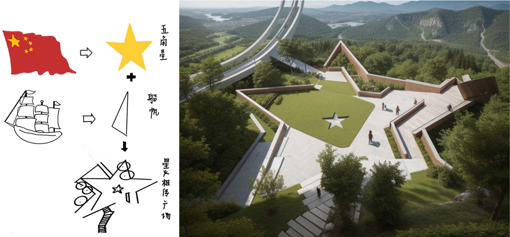 星火相传是一个以五角星为文化基因的场所(如图7),通过提取闪闪发光的红星,承载着革命历史和红色文化的丰厚内涵。通过艺术化的处理手法将其复制和放大,将这一图形转化为一个红色文化场景。它不仅在形状上符合五角星的形态,同时在设计上巧妙地加入一些现代化元素,比如边缘的部分切割,为经典的五角星形象带来趣味感。另外,在五角星的外部加入帆船元素,象征革命的大船在红色海洋中不断前行,永不停歇。设计中的帆船朝着星光的方向航行,与五角星形成了视觉和意义上的呼应,强调目标与方向坚定一致。同时运用抽象隐喻的手法,将“船”隐喻成“传”,这不仅仅是对历史的缅怀和尊敬,也是对勇往直前,刻苦进取精神的一种展现。这样的视觉符号是文化传承的重要载体。通过特定的图案、形状或色彩,景观设计师能够巧妙地传达地域文化、历史传统以及民族特色。这些符号往往与当地的历史背景、民俗风情紧密相连,使游客在游览过程中能够深刻感受到文化的厚重与多样性。
