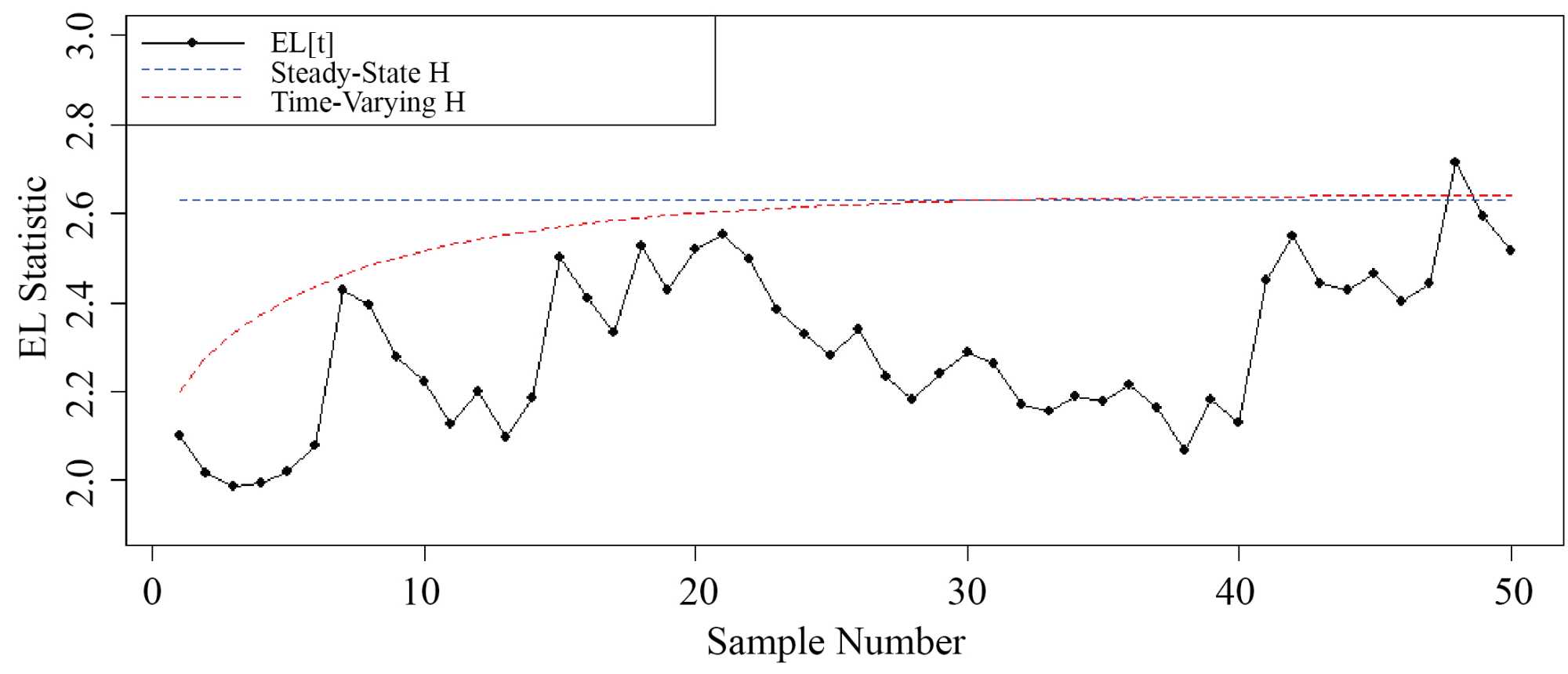 )进行实例分析。当m = 100、n = 5和ARL0 = 500时,稳态控制限系数和时变控制限系数分别为KS(EL) = 1.972、KS(EEL) = 1.918和KT(EL) = 2.008、KT(EEL) = 1.985。IC状态数据来自Montgomery [16]活塞环案例的前20组数据;待监测的15组样本数据、